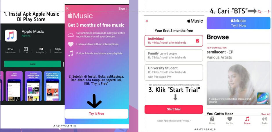 - Buat teman-teman yang belum mencoba subscriptions apple music boleh melakukan free trial dan jika sudah pernah pastikan melakukan subscriprions/berlangganan untuk 1 bulan.
