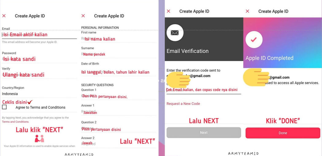 3. Klik Create New Apple ID > masukan email dan password > Continue