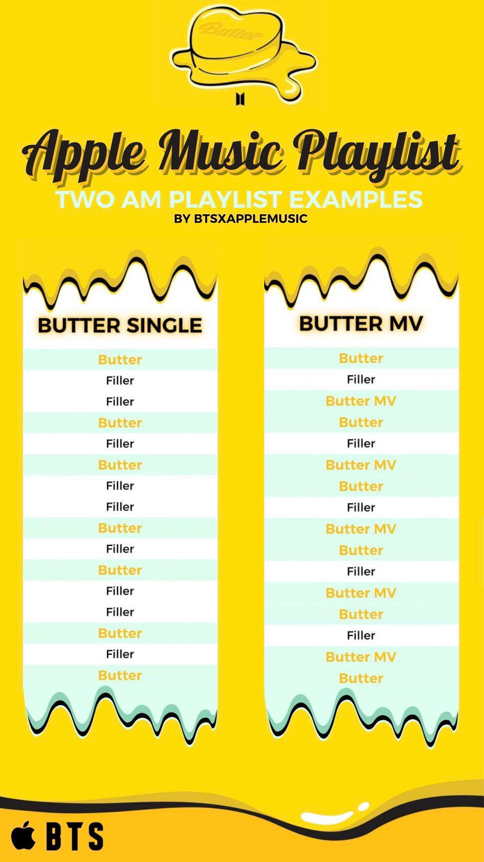 3. menambahkan 1-2 lagu untuk selipan lagu utama/Butter, kalau untuk lagu non-KPOP masukan lagu yang tidak ada di chart apple music. utamakan memasukan lagu BTS ke dalam playlist, selingan 1-2 lagu dri Butter yaa.